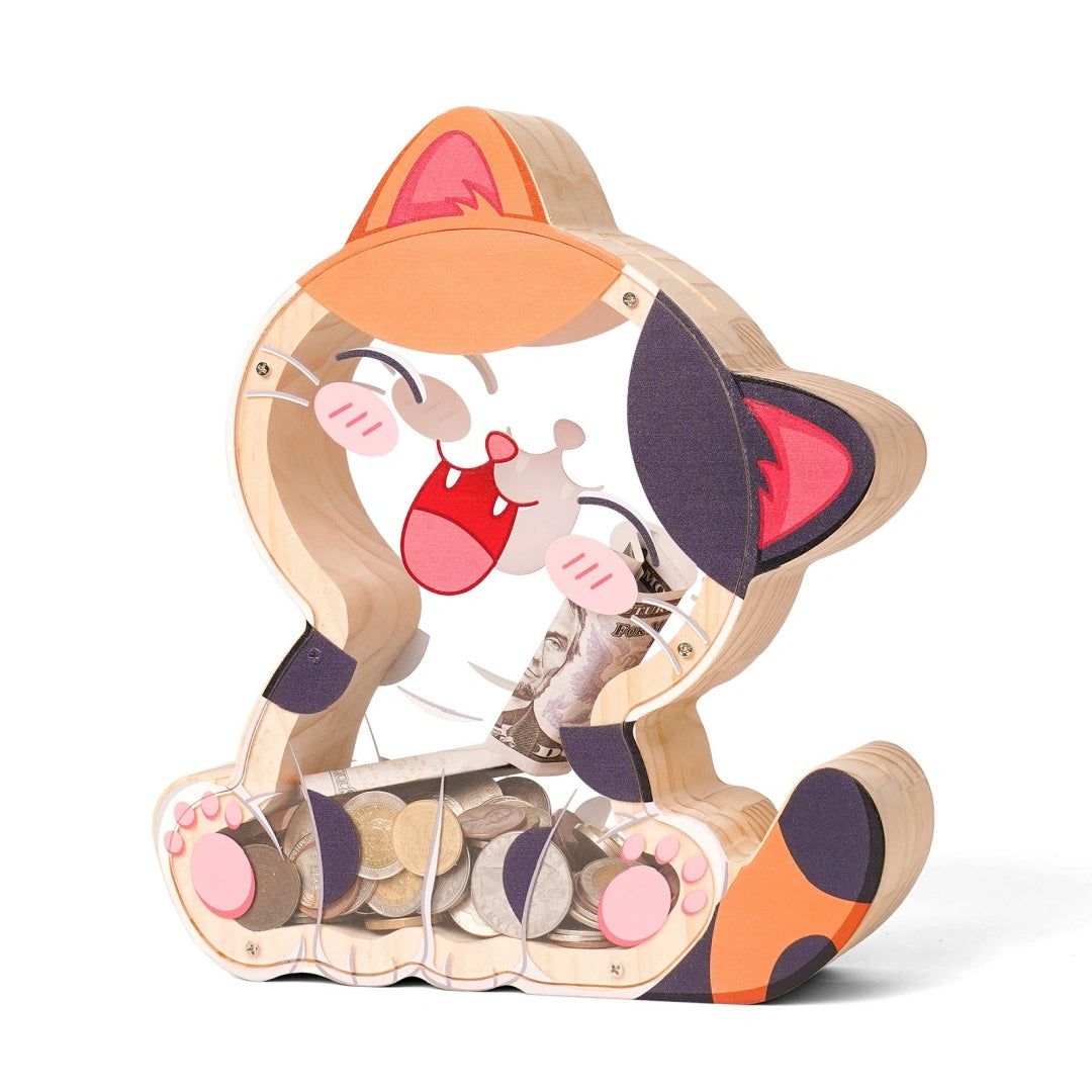 Wooden Cat Piggy Bank for Kids, Cute Money Box with Acrylic Panels, Unbreakable Toddler Saving Coin Jar for Boys Girls, Kids Coin Bank with Letter Sticker for Birthday, Christmas, Home Décor