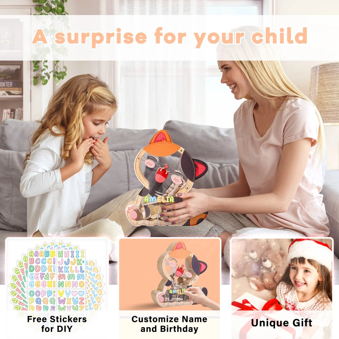 Wooden Cat Piggy Bank for Kids, Cute Money Box with Acrylic Panels, Unbreakable Toddler Saving Coin Jar for Boys Girls, Kids Coin Bank with Letter Sticker for Birthday, Christmas, Home Décor