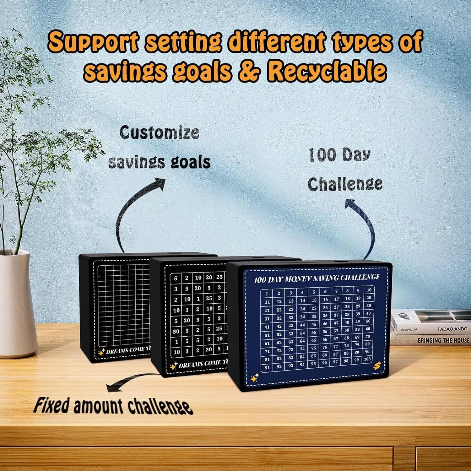Welcome to our 10000 Savings Challenge Box! Different stickers set up different saving goals for you: $10,000, $5,000, $3,000, $2,000, $1,000, and a 100-day saving challenge. In addition, you can create unique plans within the blank form. Make saving a habit and enjoy it!