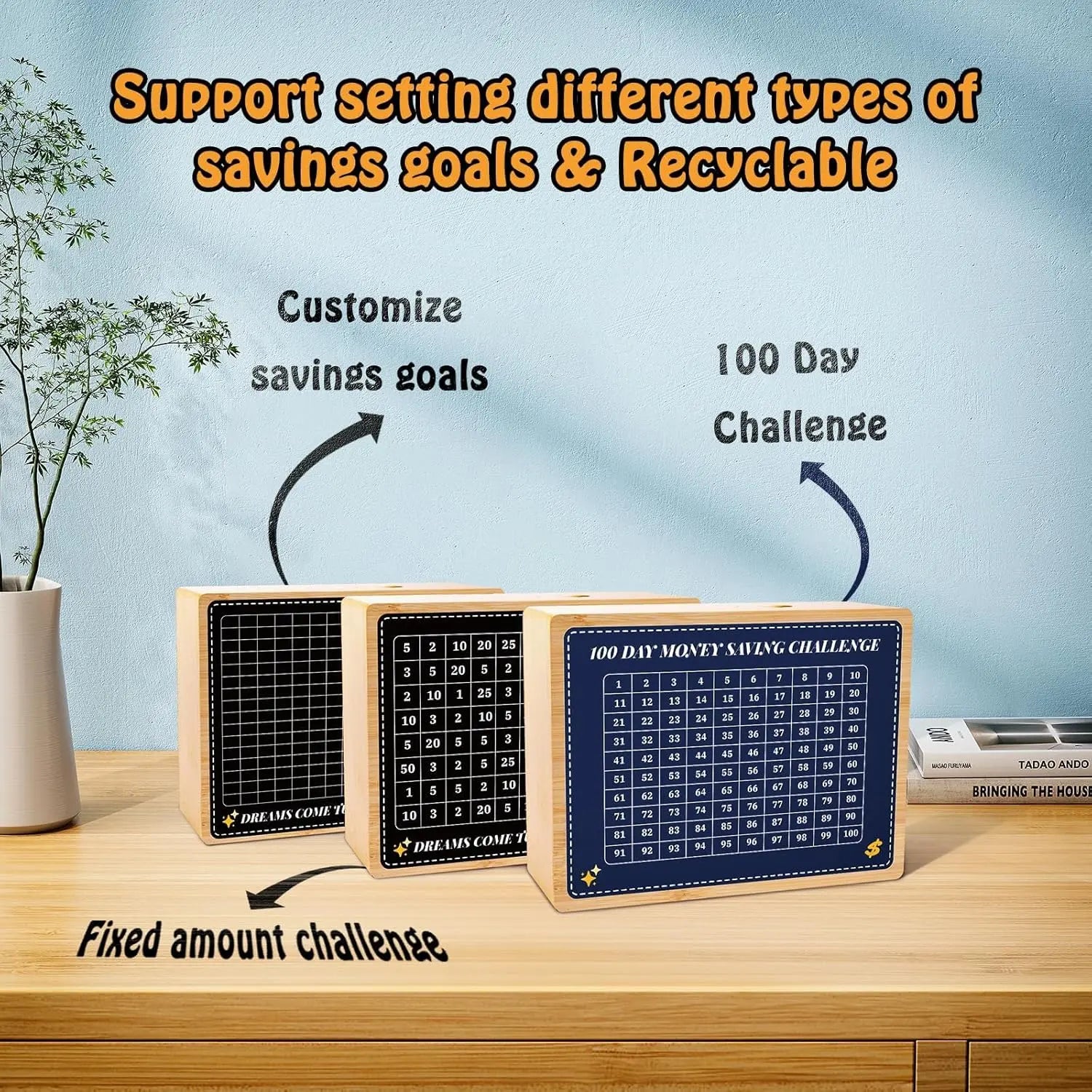 Each wooden cash savings box comes with 8 planner stickers, 4 erasable pens and 1 tweezers. You can freely set storage targets and record your deposit progress with the erasable pen. If you want to take out the money, remove the rubber plug at the back of the cashbox and get the money with tweezers.