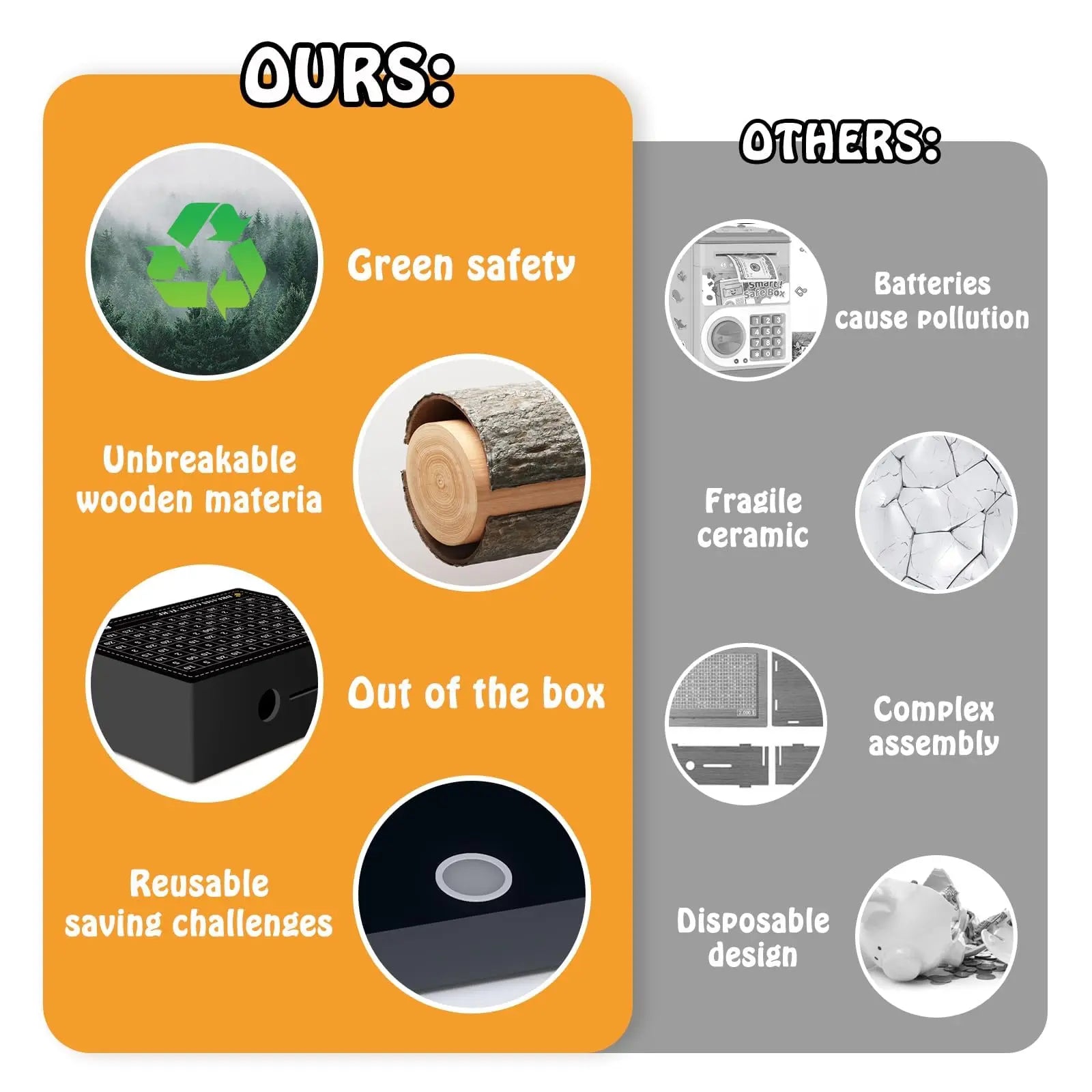 The cash box is made of natural and high quality wood, which is environmentally friendly, odorless and safe. The unbreakable piggy bank has a smooth surface, no burrs, and rounded edges that pass rigorous quality checks. It's a very durable product.