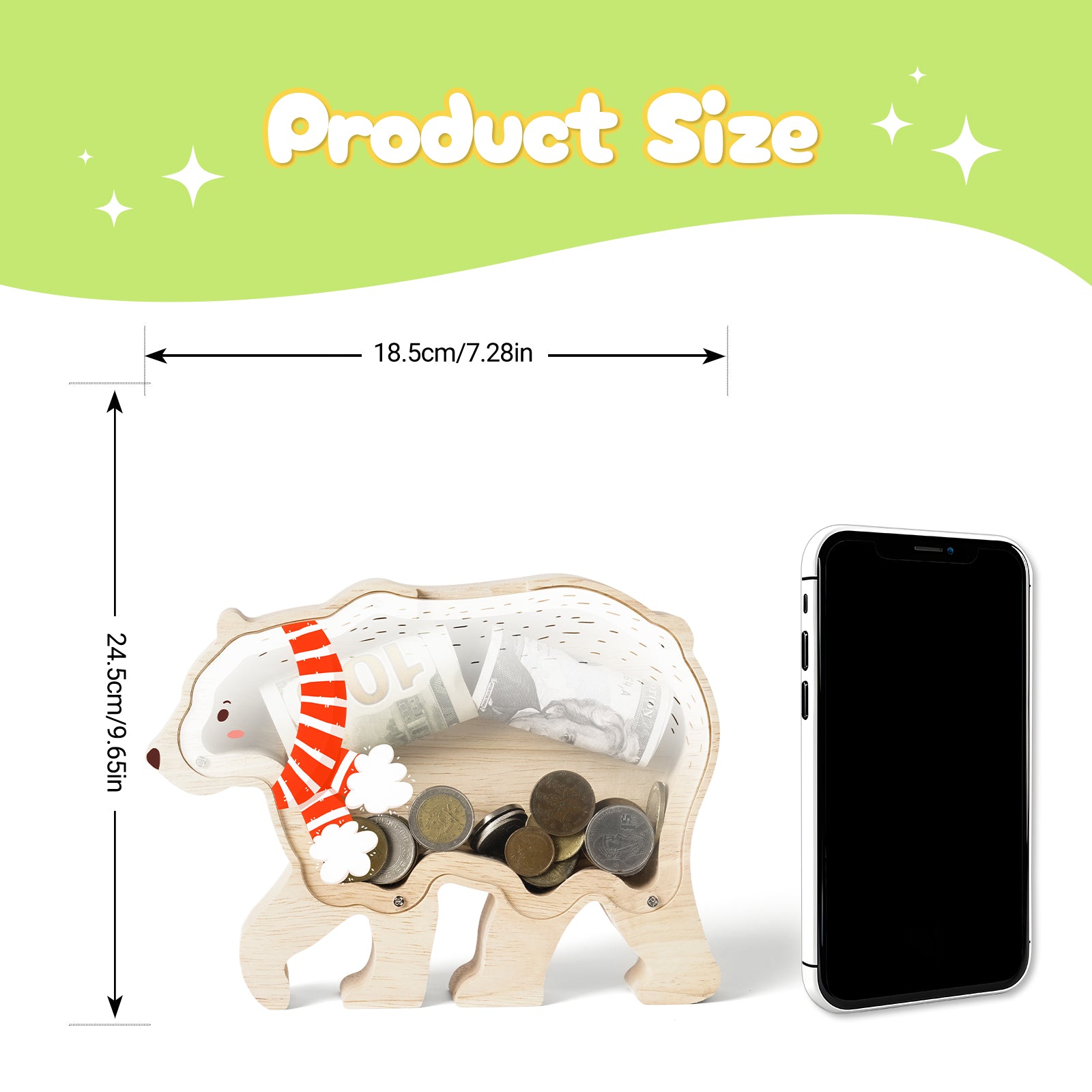 Wooden Christmas Bear Piggy Bank for Kids, Adorable Bear Piggy Bank with Acrylic Panels, Unbreakable Toddler Money Box for Boys Girls, Cute Christmas Saving Coin Jar for Birthday, Decor